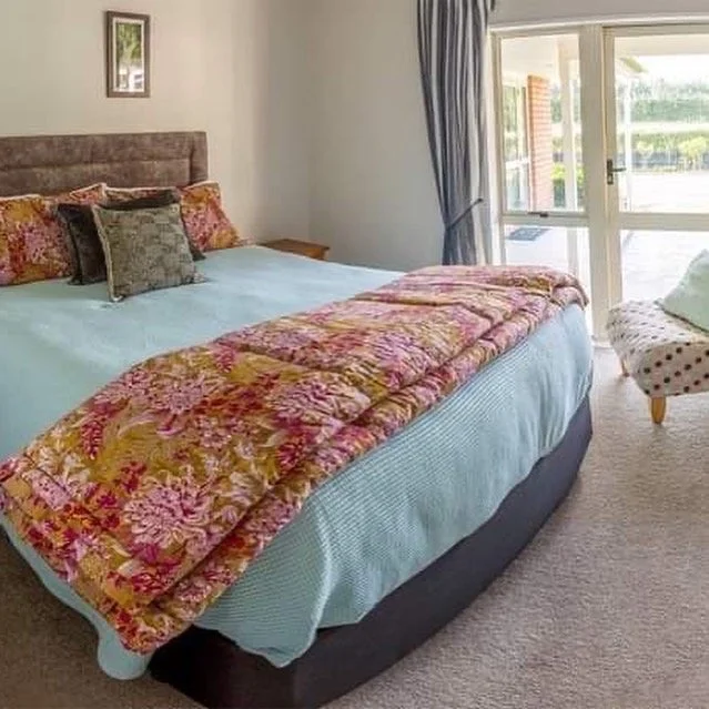Bedroom with large glass doors, light curtains, a bed with a pink throw blanket, pillows, a side table with teddy bears, and a decorative sign. Outdoor patio area visible through doors.