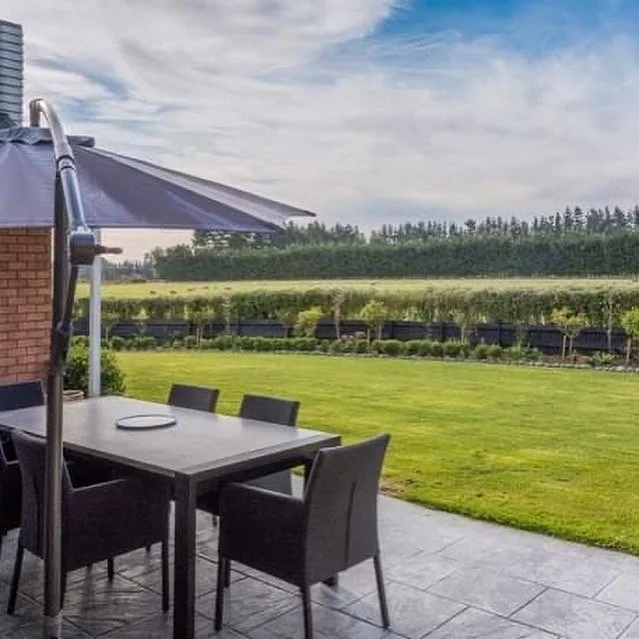 Outdoor patio with table, chairs, and parasol overlooking a lawn and fields with trees in the distance.